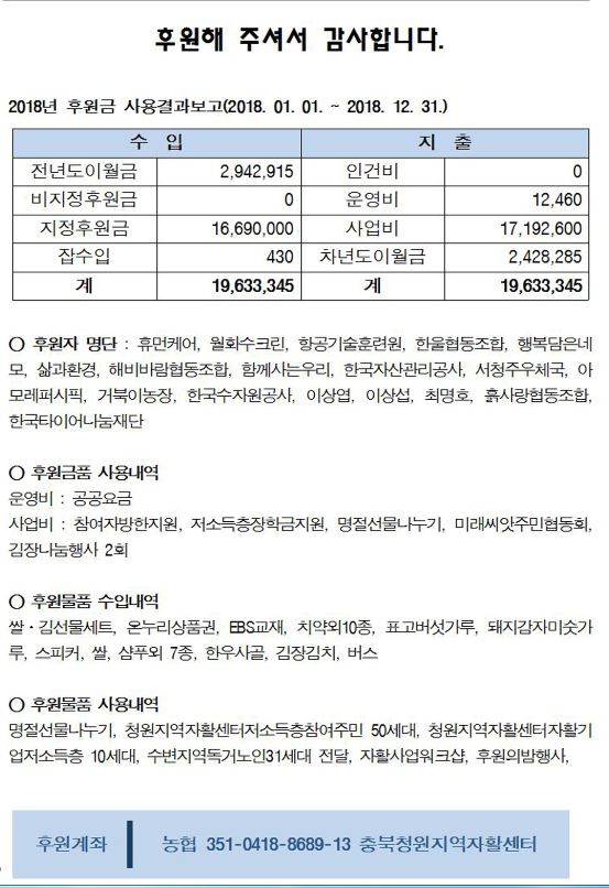 충북청원지역자활센터 2018년 후원금품 수입 및 사용결과보고서 공고