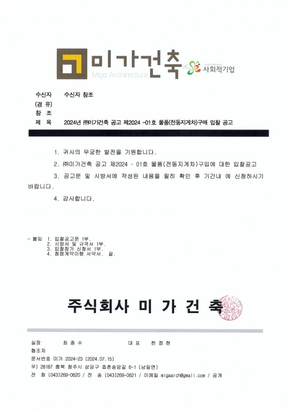 2024년 (주)미가건축 공고 제2024-01호 물품(전동지게차)구매 입찰 공고