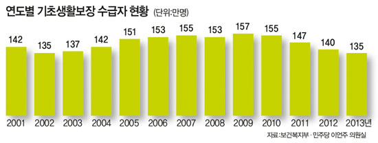 민주당 이언주 의원실이 공개한 자료를 보면, 사회복지통합관리망(행복e음)이 개통된 2010년부터 2013년까지 20만1987명이 수급 중지 대상 통보를 받았다. 연평균 5만명 수준이다. 2011년부터 3년간 본인과 부양의무자의 소득·재산이 파악돼 급여가 감소된 이들도 74만7176명이나 된다. 2010년 155만명이던 기초수급자는 2013년 135만1000명으로 감소했다.