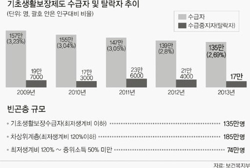 2009년 157만 명에 이르던 기초생활수급자는 지난해 135만 명까지 감소한 반면 수급중지자, 즉 수급을 받다가 탈락한 사람은 2010년 17만3000명에서 2012년 21만4000명으로 늘다가 2013년 다시 17만명 선을 회복했다. 정부는 '증세 없는 복지' 실현을 위해 부정수급자를 걸러냈다며 홍보했지만, 그 안에는 선의의 피해자 역시 적지 않다고 전문가들은 지적한다.