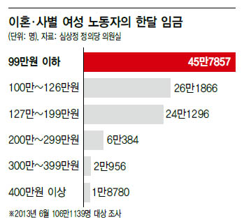 이들이 감당하는 노동조건은 열악했다. 이혼·사별 여성 노동자의 월평균 임금은 112만2000원으로, 지난해 최저생계비 126만315원(3인가구 기준)보다 적었다. 실제 71만9723명(67.8%)이 최저생계비보다 적게 벌었고, 5명 중 1명(21만6713명)은 55만원 아래였다. 식당일로 한달 150만원가량을 벌었다는 송파의 세 모녀 가정보다 적은 셈이다. 반면 같은 여성 노동자라도 배우자가 있는 경우 160만7000원, 미혼은 164만7000원을, 같은 이혼·사별 처지라도 남성은 190만2000원을 벌었다.